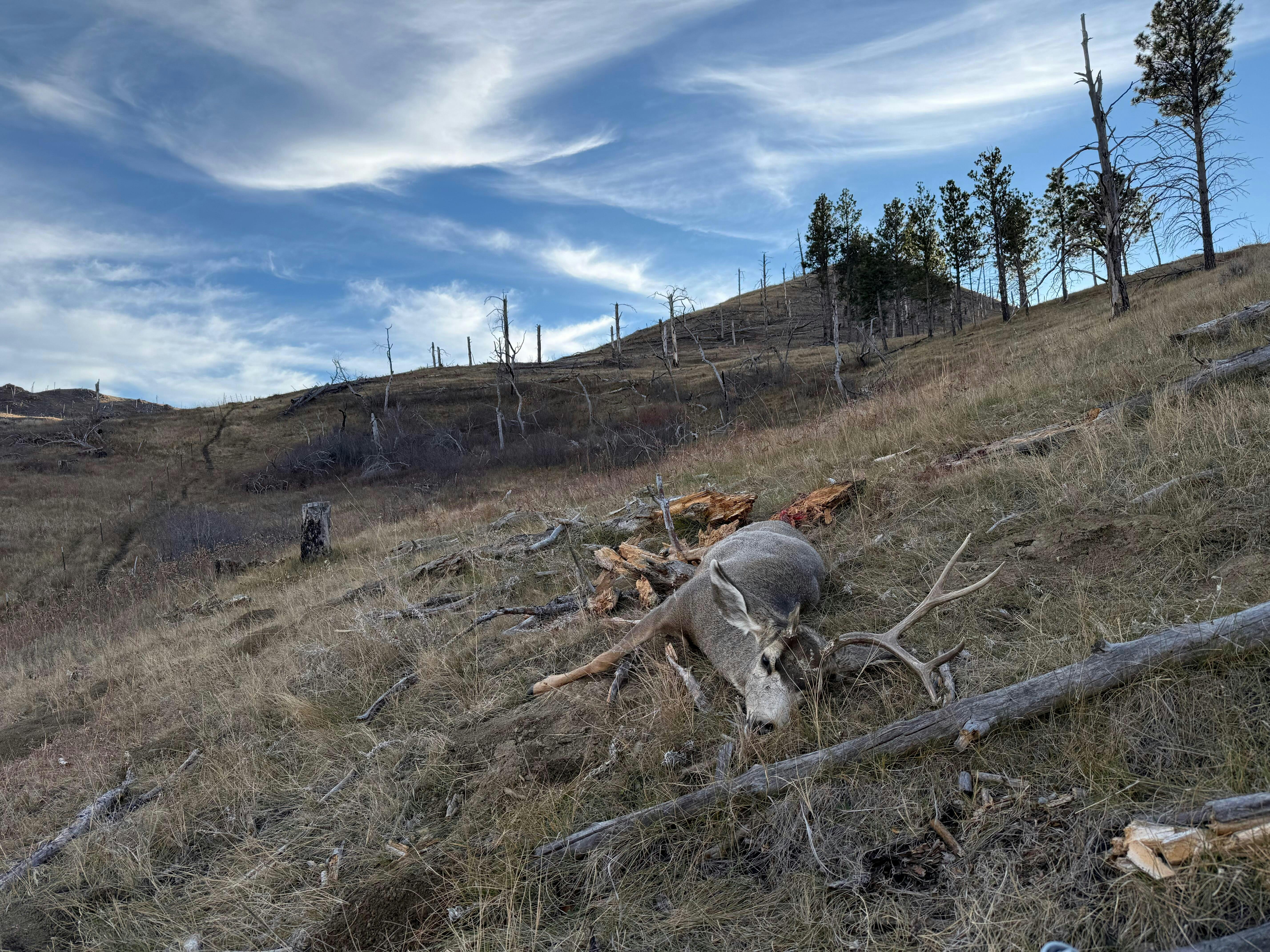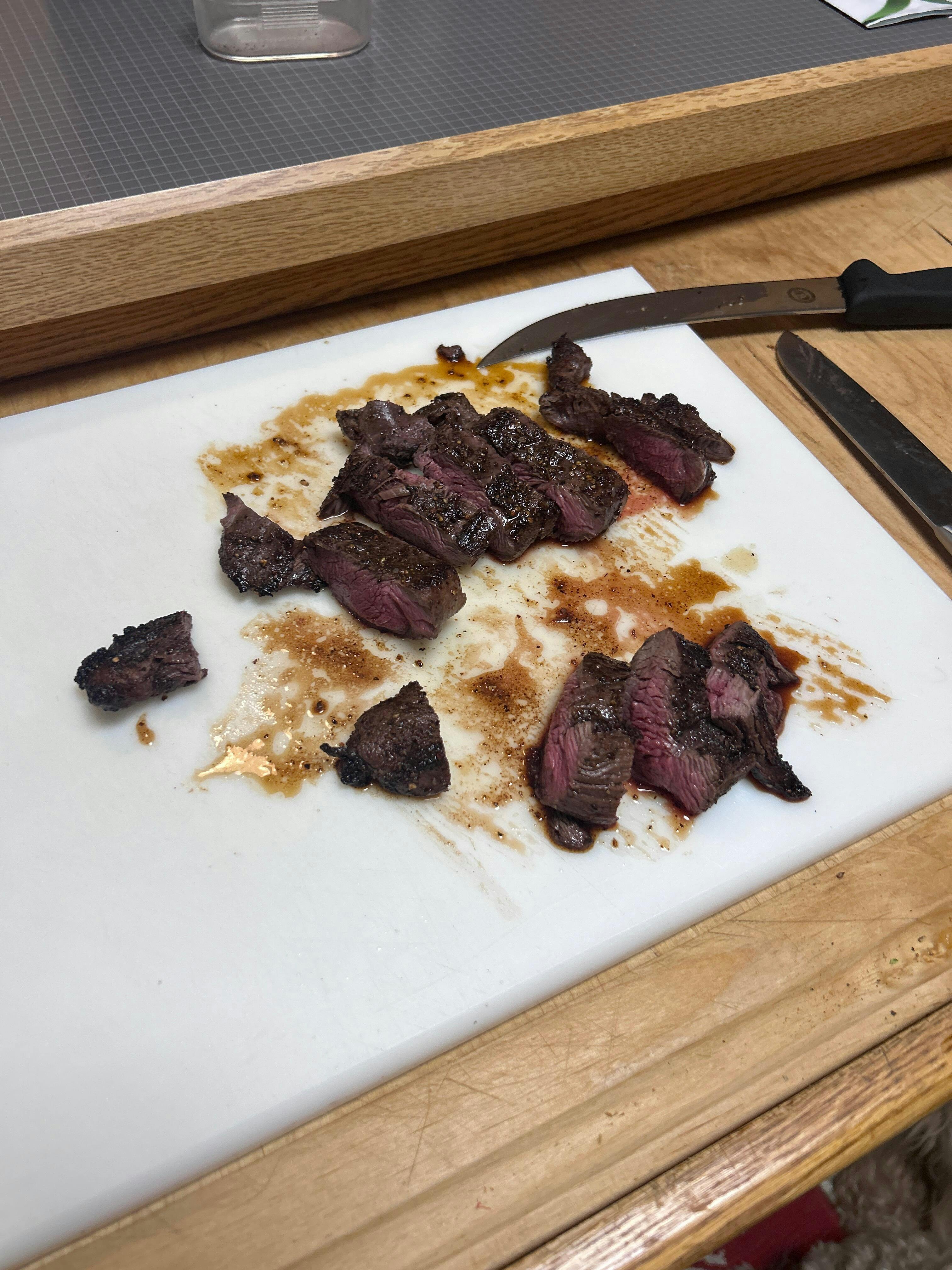Worked great for their first Muley butcher. Hung, skinned and deboned in less than 90 minutes. Muley tenderloin on the cutting board. Knife in the picture as well.
