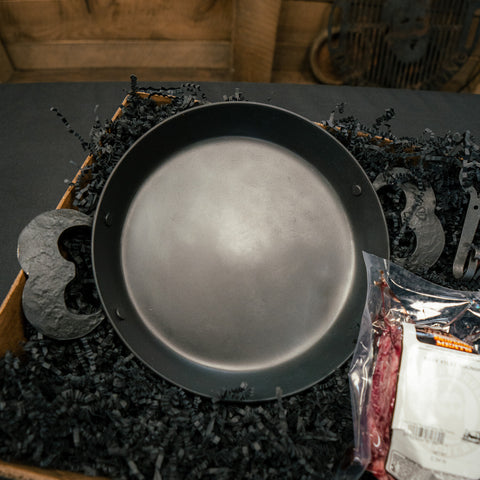 Our hand forged carbon steel skillets are the perfect addition to any kitchen. Crafted with care by the skilled blacksmiths at Lockhart Ironworks in Southern Ohio, each skillet is a unique piece of art. They use traditional methods to forge each pan, which results in a durable and beautiful piece of cookware. This skillet is made exclusively for The Bearded Butchers!