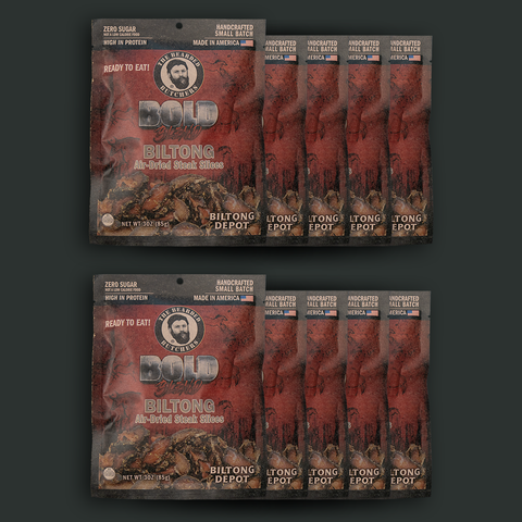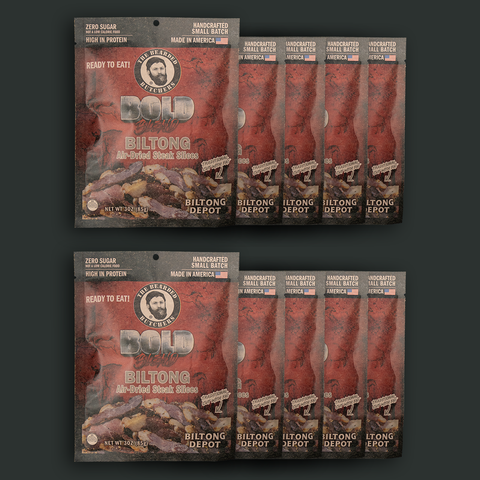 Made in small batches in America, using traditional South African methods, this delicacy is crafted using the finest cuts of beef, air dried to perfection with the exclusive Bearded Butcher Blend BOLD Seasoning. Unlike smoked jerky, our beef biltong steak slices are expertly air-dried, preserving the natural meaty goodness and intense flavor profile. It's thin sliced across the grain, for a tender, delicious bite!